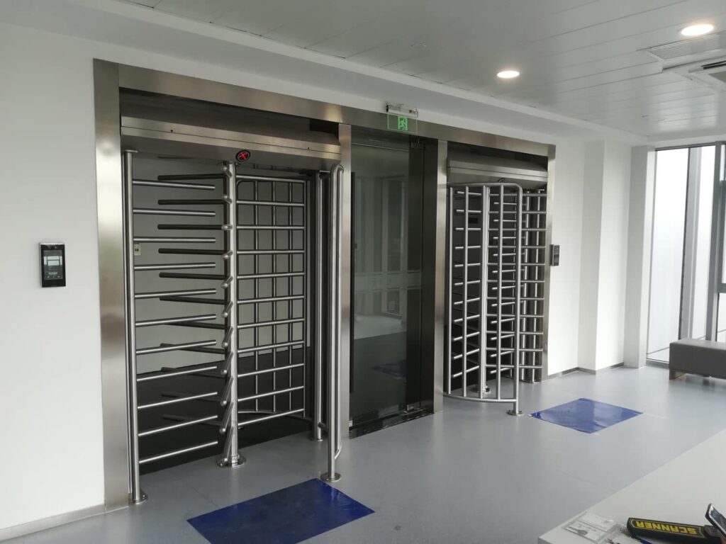 We provided and installed a combination of dual-lane full height turnstiles and a fire emergency door, perfectly matching the building’s entrance layout.